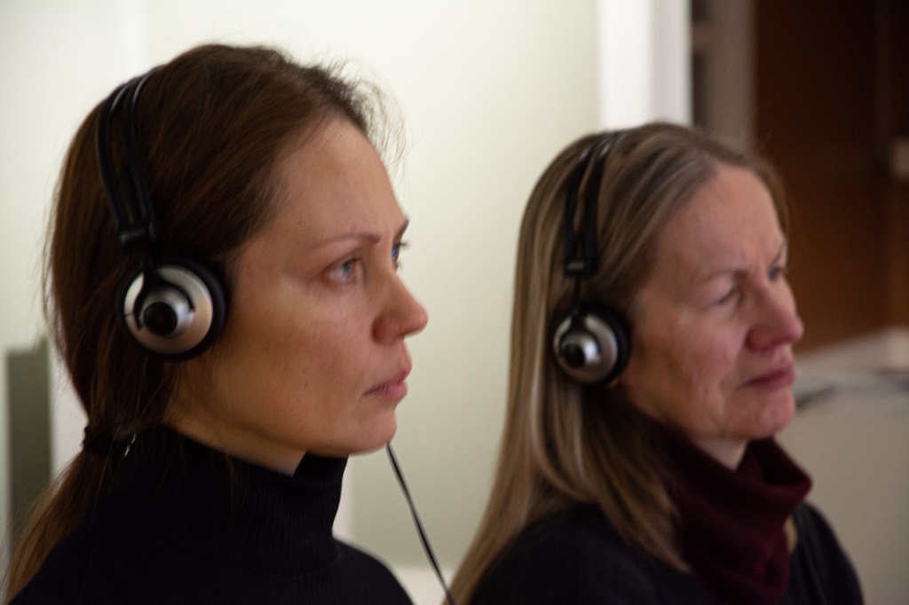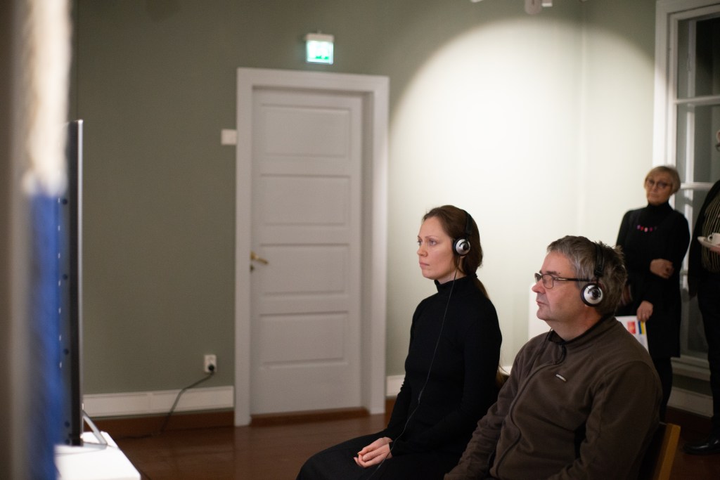 The performance consisted of Maryna watching a video created from a video of knitting and audio messages from a Ukrainian woman, the mother of a son who died in the war with the Russian Federation in August 2022. Maryna placed a chair next to her and another pair of headphones, thus inviting viewers to join in watching the video, taking part in the performance. Each viewer could choose the moment and duration of viewing.