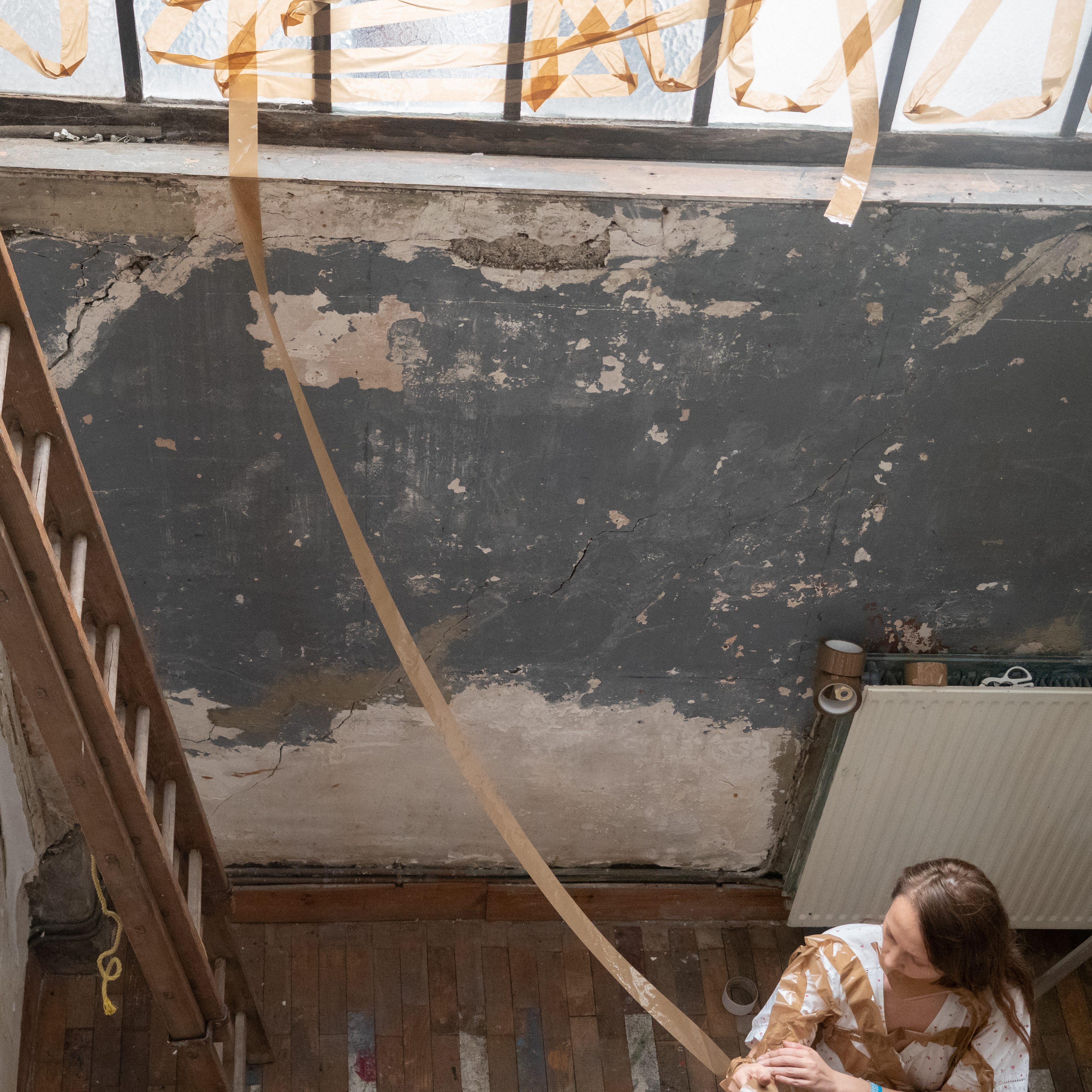 Created at Atelier 11 / L’AiR ARTS, Paris, during a two-month residency, the performance layers visual, sonic, and installation elements to reimagine bodily reactions and everyday materials as symbolic expressions of trauma. The act of taping windows—a gesture of protection, isolation, and creating safety—becomes a metaphor for collective states of vulnerability and resilience.